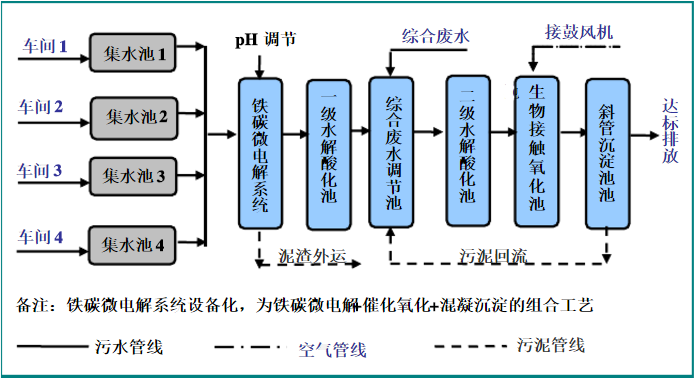 各類生產(chǎn)線的廢水進行單獨收集,之后統(tǒng)一送入初調(diào)節(jié)池中進行水質(zhì)的調(diào)節(jié),;預(yù)處理采用“鐵碳微電解+催化氧化+混凝沉淀”工藝,沉淀溢流到一級水解酸化池中,之后流入到綜合調(diào)節(jié)池中,與生活污水、清潔下水混合后,送入二級水解酸化池,水解后出水至生物接觸氧化池中進行好氧處理,處理后水進入沉淀池中,上清液排放。